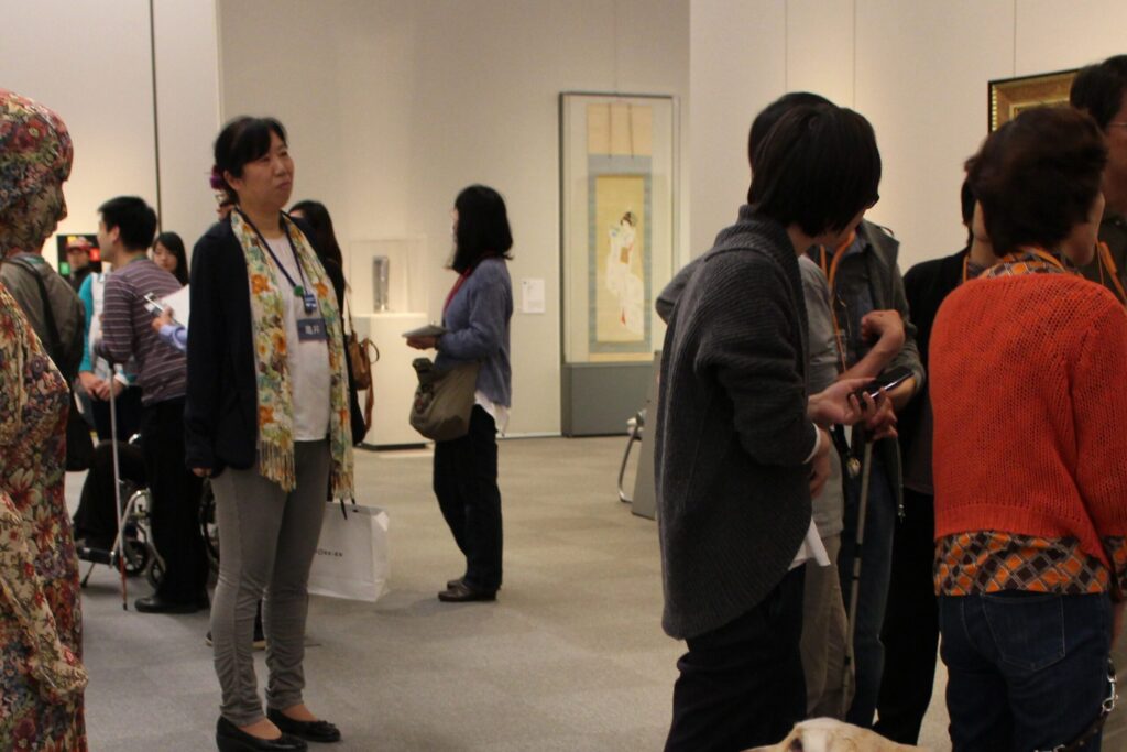 ロビーで「これなんだろう、人かな?」と質問が出たら、ヘルパーさんが付箋に書いて、それを展示室に持っていて、筆談をしている人たちの中に貼ることで、目の見えない人から質問が出たことを静かに伝えてもらいました。そのコメントに対して感想とかの書き込みが追加されたら、サポーターが展示室でそーっとマイクを使ってコソコソと音声で読み上げてくれるのを、ロビーで聞くんです。